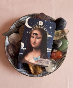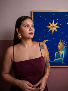 Ana Calderon é uma artista visual e designer que transforma mensagens do inconsciente em arte. Em 2020, iniciou seus estudos na cartomancia como forma de desenvolver sua mediunidade, aprofundando sua conexão com o universo simbólico e intuitivo que atravessa todo o seu trabalho.