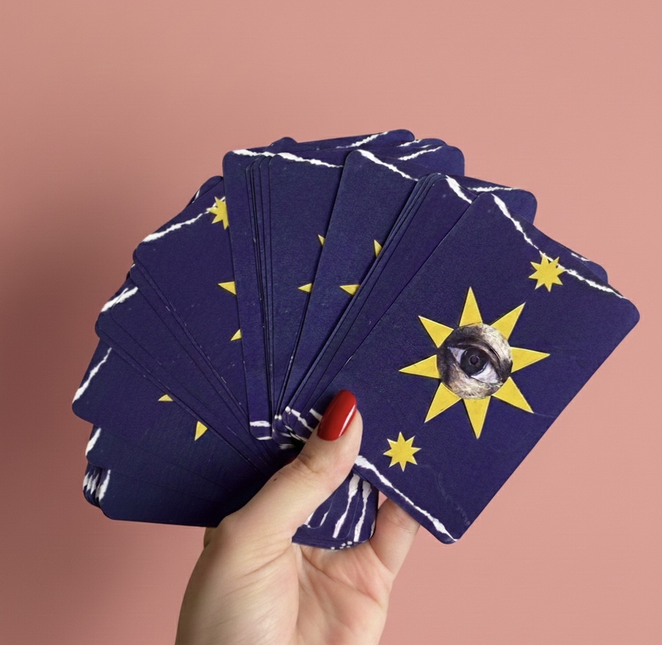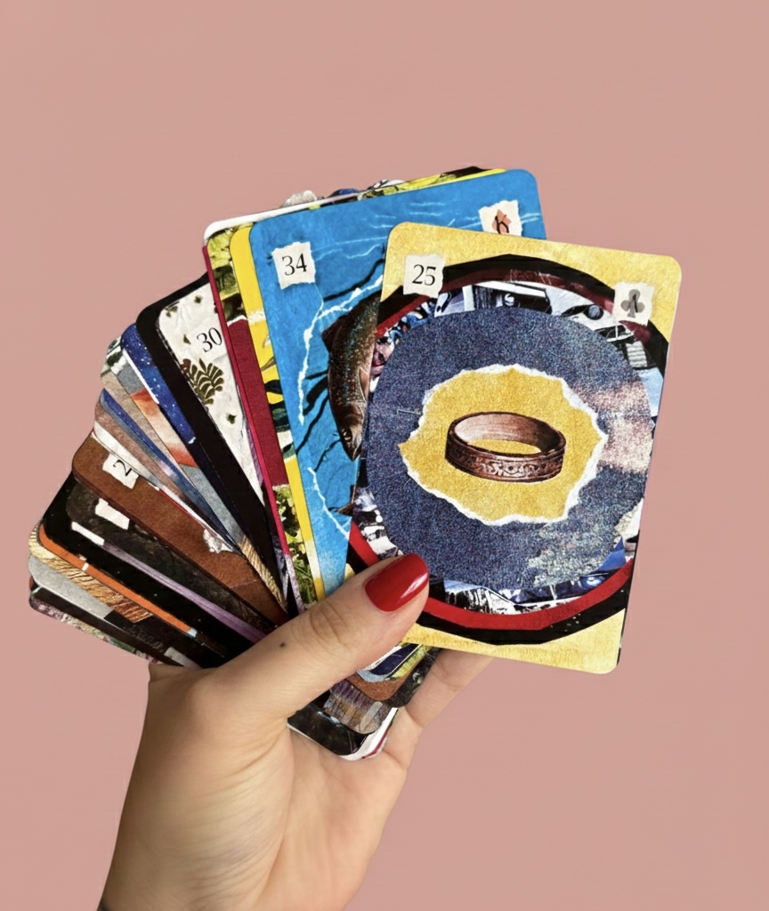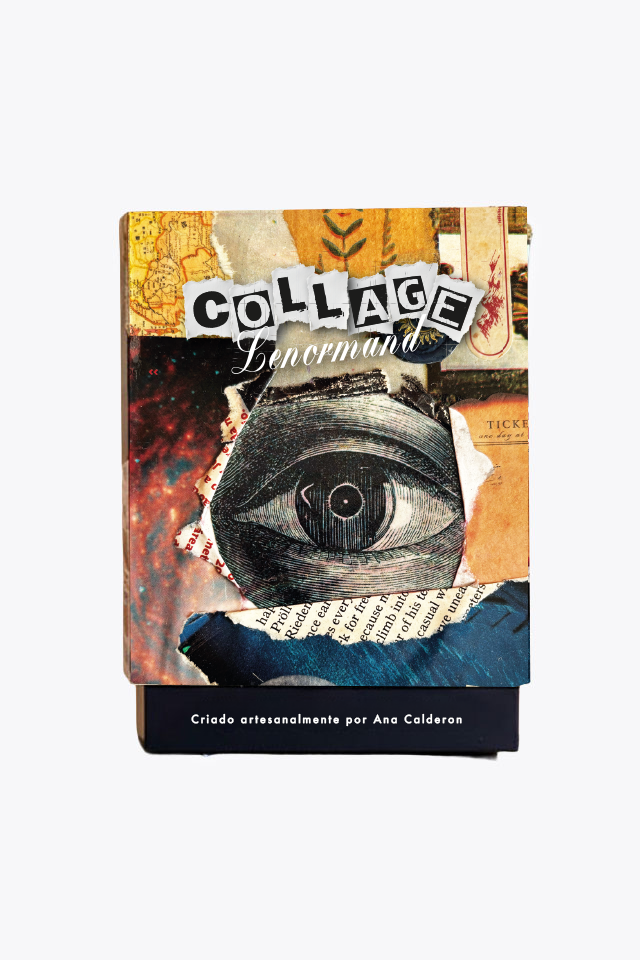 O Collage Lenormand é um baralho autoral criado do zero por Ana Calderon, artista que une colagem, intuição e simbolismos em suas criações. Desenvolvido por meio de colagens analógicas feitas manualmente, este projeto nasceu de um processo profundo, sensível e extremamente importante em minha trajetória criativa.