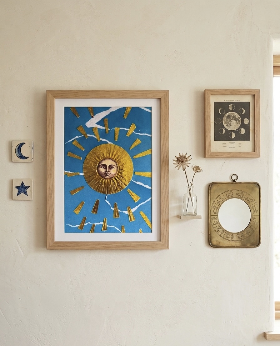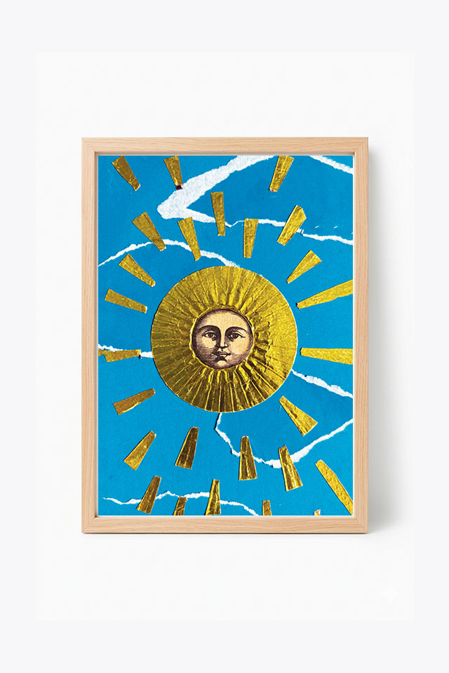 Esta reprodução da obra O Sol traz a força simbólica da carta do baralho cigano, reinterpretada em uma criação autoral de Ana Calderon. Cada detalhe foi pensado para transmitir vitalidade, sucesso e clareza, tornando-se não apenas um elemento decorativo, mas também um convite diário à energia positiva.